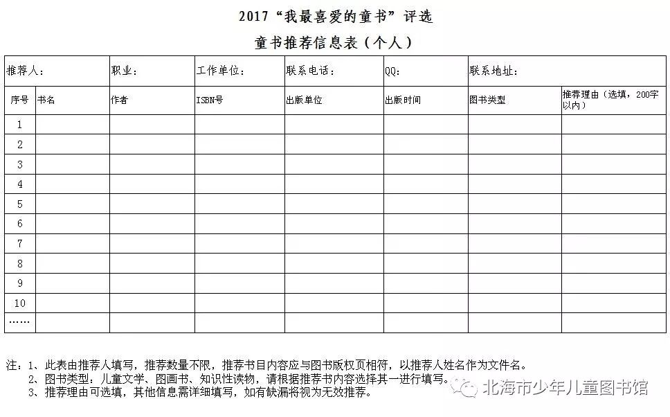 3、推荐书目的途径:填写《个人推荐表》或《单位推荐表》,发邮件到邮箱3534768714@qq.com。为确定推荐时间先后,本届推荐书目均通过邮件完成,不接受纸质推荐或QQ文件传送。如无法通过邮件方式提交推荐信息的,请联系本馆。