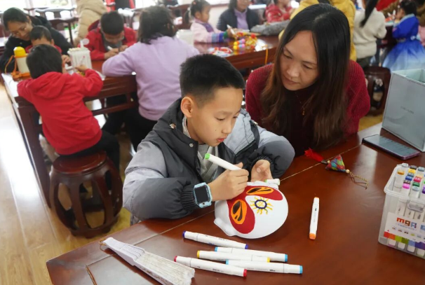 接着,孩子们手握画笔,在空白面具上挥洒灵感:有的画上铜鼓纹样,有的添缀绣球纹样……活动尾声,小读者们独一无二的“壮族美猴王面具”齐齐亮相,传统纹样与经典IP碰撞出的文化火花。