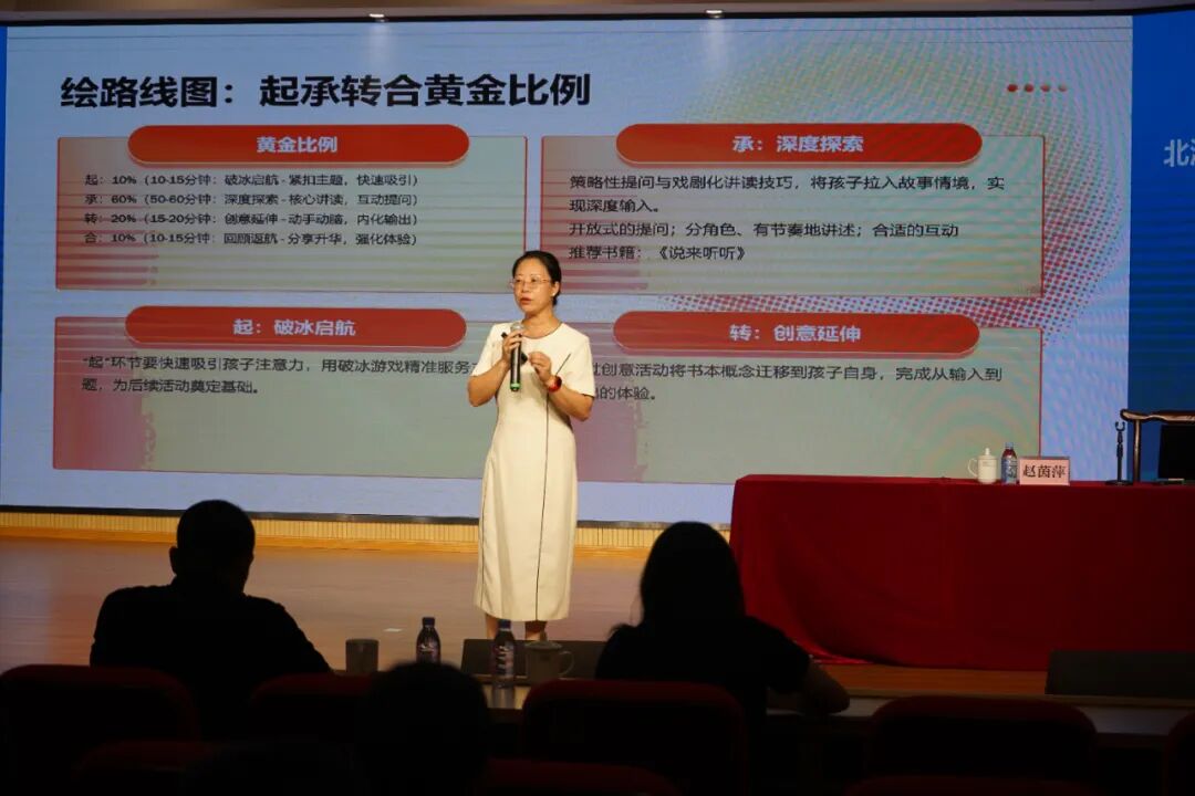赵茵萍老师则以“不止是书本,更是旅行——如何策划一场让孩子沉浸其中的阅读探险”为主题,从孩子的阅读心理出发,提出“沉浸感=明确主题+故事线流程+感官体验”的核心公式。她用生动案例展示了“起承转合”的黄金比例故事结构,并分享了如何将活动通知转化为吸引孩子的“邀请令”。此外,她还通过策略性提问与戏剧讲读的方式,引导学员掌握让阅读更具参与感与趣味性的技巧。