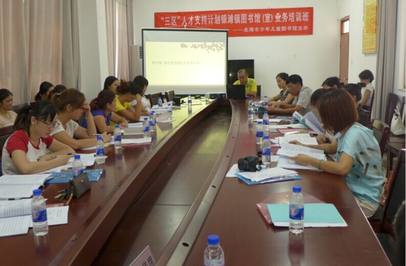 6月18日始,北海市少年儿童图书馆工作人员一行8人冒着酷暑“送培训进基层”, 分别到平阳镇、银滩镇和福成镇开展“三区”文化人才支持培训。实施边远贫困地区、边疆民族地区和革命老区人才支持计划文化工作者专项工作,是支持边远贫困地区、边疆民族地区和革命老区文化工作事业发展的重要举措。北海市少年儿童图书馆结合全国文化基层人才队伍建设规划,经过一系列的统筹安排,组织该馆的业务骨干和一线业务能手分别深入各乡镇,因地制宜开展业务培训。