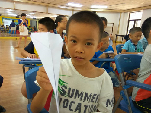 庞老师结合生活中的典型案例,分别从轮船、汽车的设计理念以及不同年代飞机各项数值的比较开始讲解,启发、引导小朋友们深入思考设计的基本过程。庞老师认为,一个成功的设计一般分为五个步骤:确定问题,设计方案,制作模型,测试、评估、优化,编写说明书。随着小朋友们热情的高涨,庞老师引导大家参加“折纸飞机”的互动竞赛。小朋友们纷纷折出自己独创的飞机样式,排队进行计时比试,看谁的纸飞机飞得更高更远。