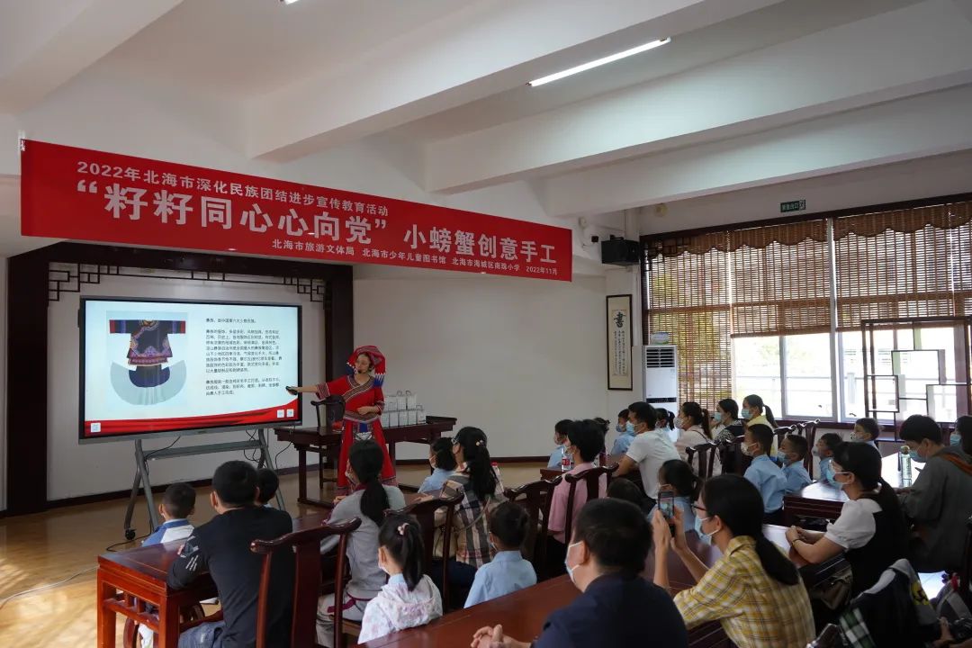 为进一步传承和弘扬中华优秀传统文化,促进民族团结,11月13日,北海市少年儿童图书馆在二楼国学馆开展深化民族团结进步宣传教育活动——“籽籽同心心向党”小螃蟹创意手工,约40名家长和孩子参与其中。