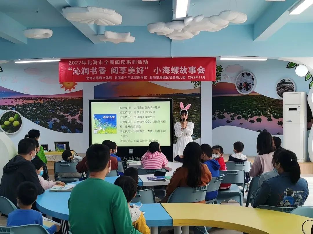 11月5日,我馆在馆内海丝路阅读馆举办了北海市全民阅读系列活动——“沁润书香 阅享美好”小海螺故事会。本次故事会由海城区机关幼儿园的老师们用生动有趣的语言,声情并茂地为大家分享了绘本故事《逃家小兔》,讲述一只小兔子和妈妈玩语言捉迷藏的故事;有趣的故事会不仅让孩子们从中感受到快乐,也懂得了许多道理。