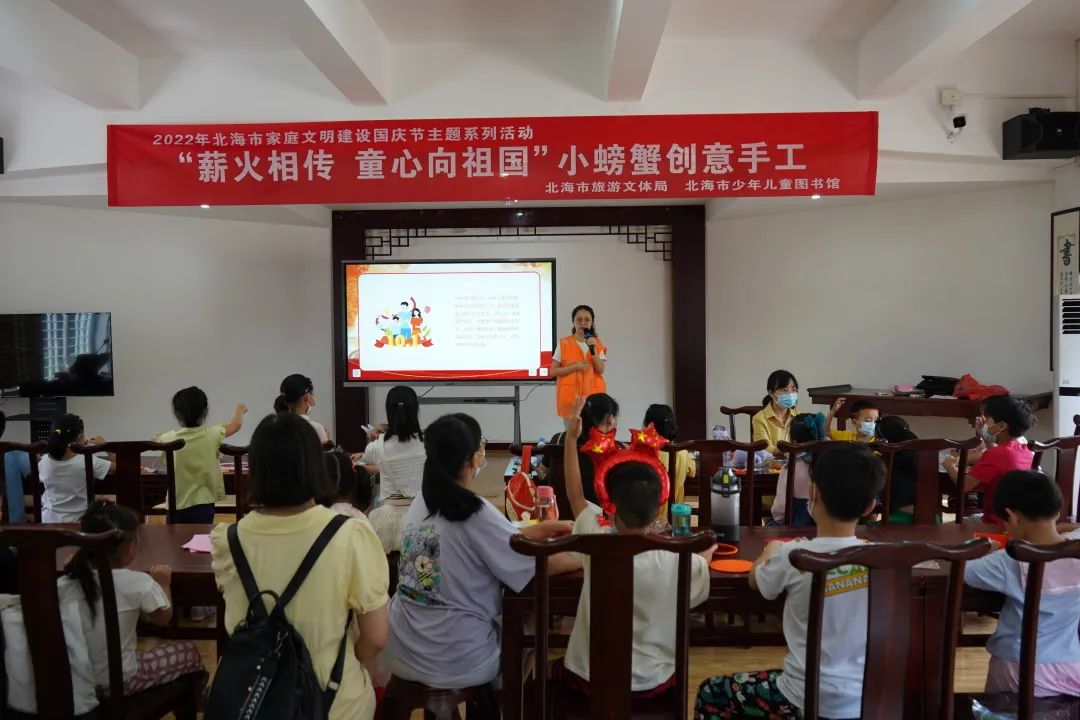 同天上午,我馆还在二楼国学馆开展了“薪火相传 童心向祖国”小螃蟹创意手工活动。由馆员教授小读者们制作国庆节节日手工。在活动开展过程中,让孩子认识了解新中国的诞生来之不易,从而促使萌发幼儿热爱祖国的情感。