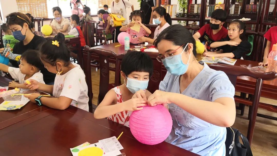 还在二楼国学馆开展“中华民族一家亲 团圆共话中秋情”小螃蟹创意手工活动。大家一同制作中秋花灯,活动现场,馆员还精心设置了猜灯谜环节,让读者们感受中秋节日的快乐氛围。在馆员和家长指导下,小朋友们的巧手不一会儿就将一个个花灯制作完成。