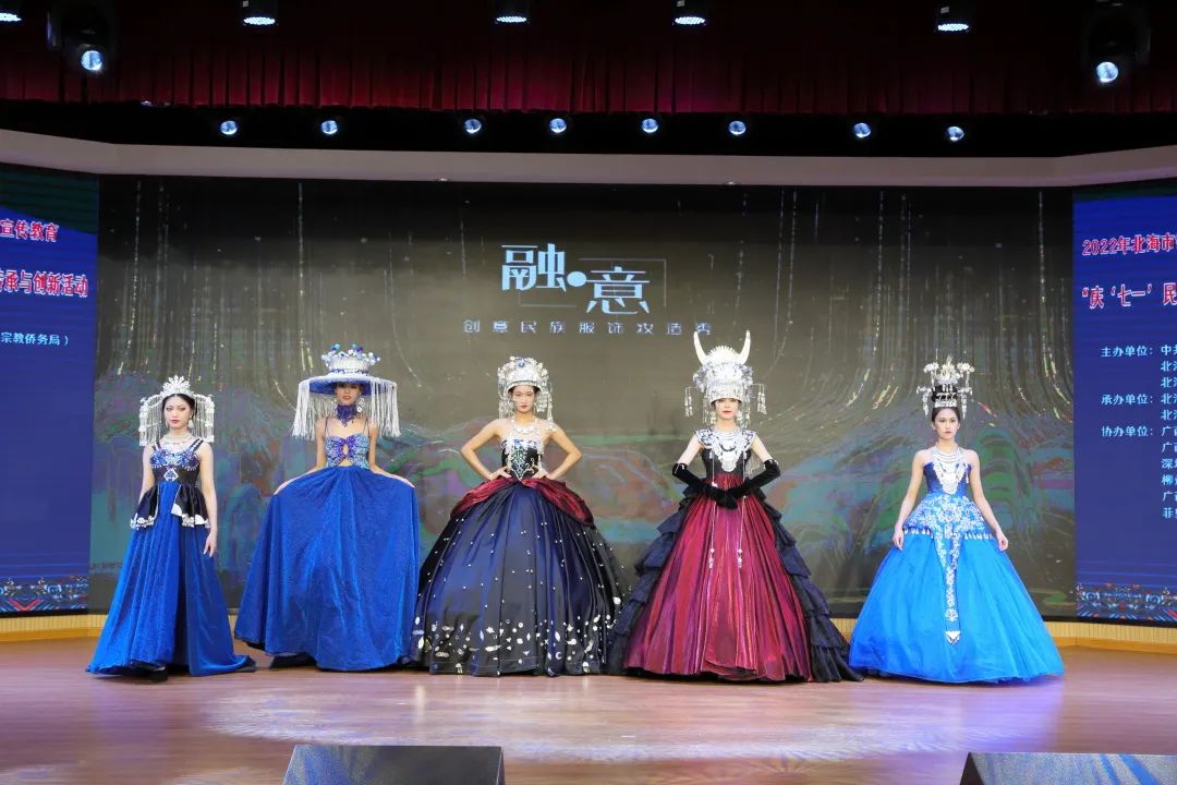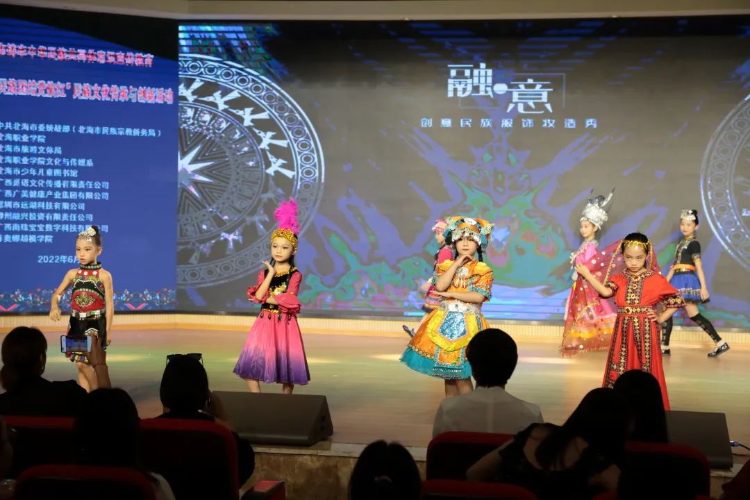 本次活动包括少年儿童广西民族服饰妆造秀、优秀民族服饰妆造设计作品创意分享、北海职业学院文化与传媒系人物形象设计专业学生作品秀、区级非遗传承人广西侗族服饰妆造文化介绍、亲子家庭互动等五个部分,共50名少年儿童与当代大学生进行了广西民族服饰妆造秀表演,30组亲子家庭参与。