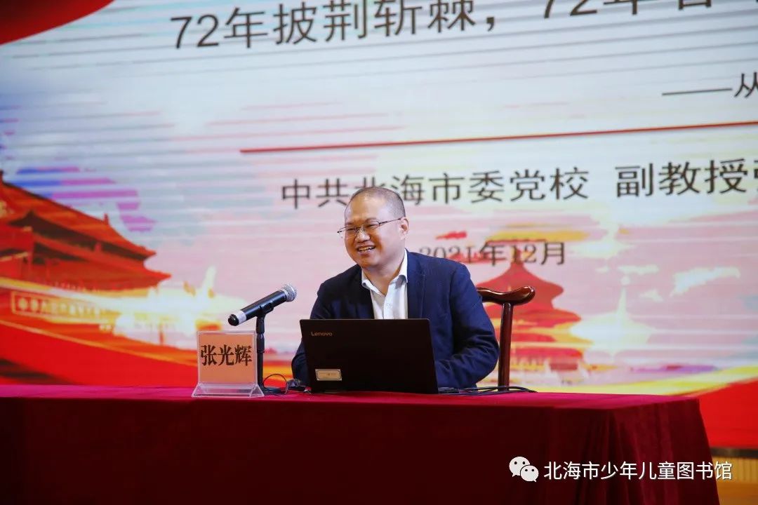 活动在市少儿图书馆的多功能报告厅开展,活动邀请了市委党校副教授、党史学习教育北海市宣讲团成员张光辉进行授课,他主讲了《72年披荆斩棘,72年春华秋实——从新中国史中汲取智慧和力量》,向大家讲述新中国成立以来,中国共产党团结带领人民艰苦奋斗、开拓进取、创新创造的伟大实践和伟大成就。