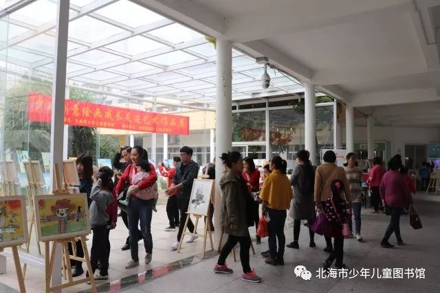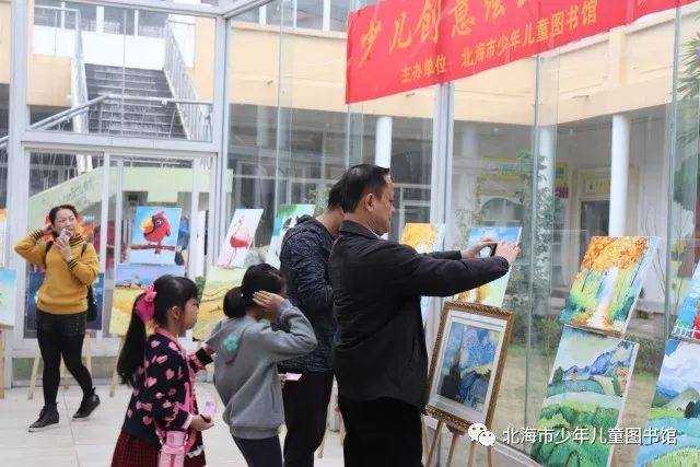 2018年1月23日,北海市少年儿童图书馆携手创壹童画少儿美术教育在馆内玻璃展厅和回廊联合举办了少儿创意绘画成长足迹艺术作品展。
