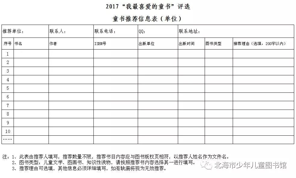 3、推荐书目的途径:填写《个人推荐表》或《单位推荐表》,发邮件到邮箱3534768714@qq.com。为确定推荐时间先后,本届推荐书目均通过邮件完成,不接受纸质推荐或QQ文件传送。如无法通过邮件方式提交推荐信息的,请联系本馆。