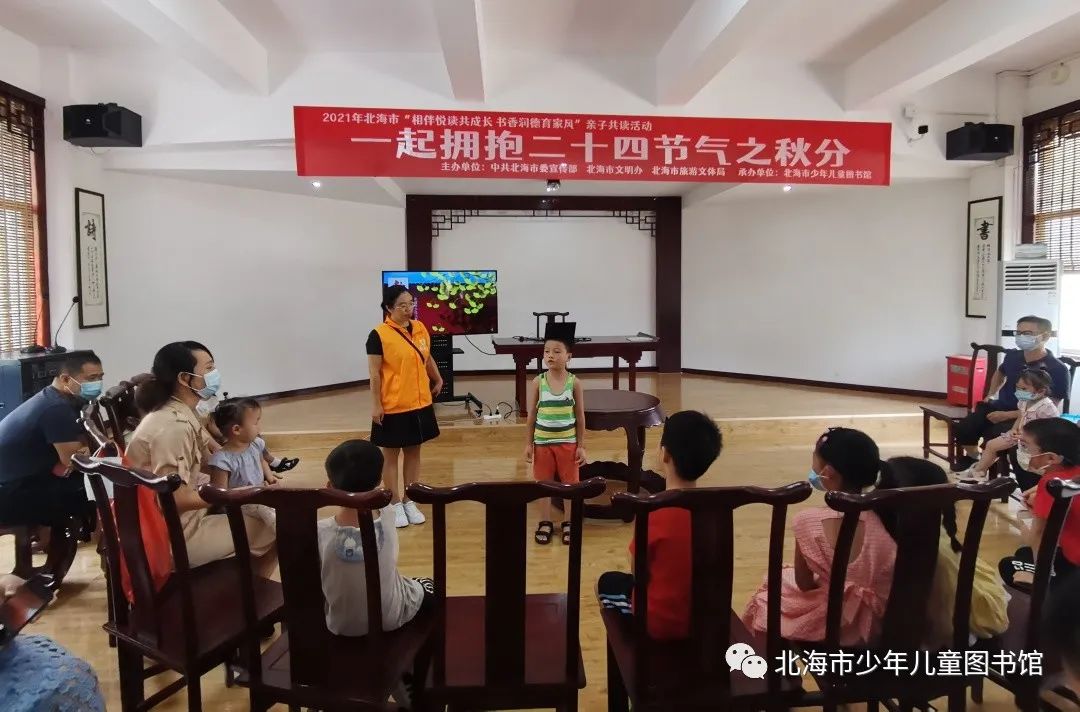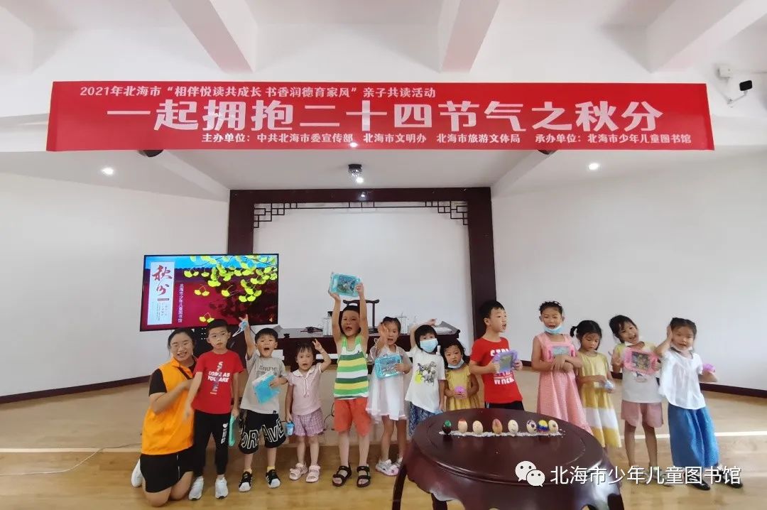 为让孩子了解秋分习俗,体会秋分天气的变化,亲近大自然,北海市少年儿童图书馆于9月20日上午在国学馆举办了“一起拥抱二十四节气之秋分”活动。