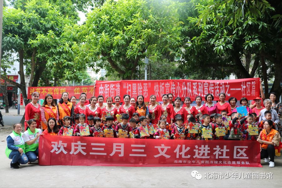 2019年3月29日上午,北海市少年儿童图书馆文化志愿服务队到广场东里社区开展“欢庆三月三 文化进社区”志愿服务活动,并协办广场东里社区开展的“党旗领航促和谐 中华民族一家亲”三月三主题活动。