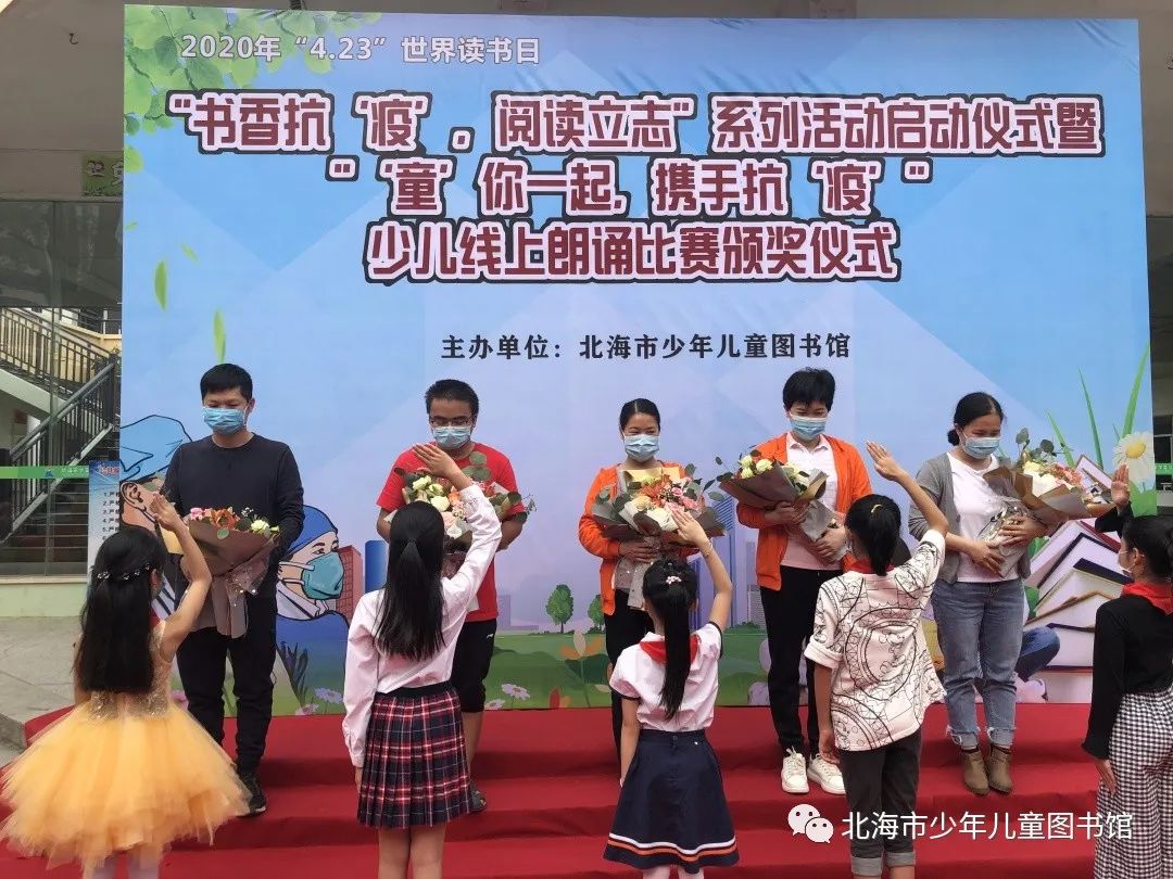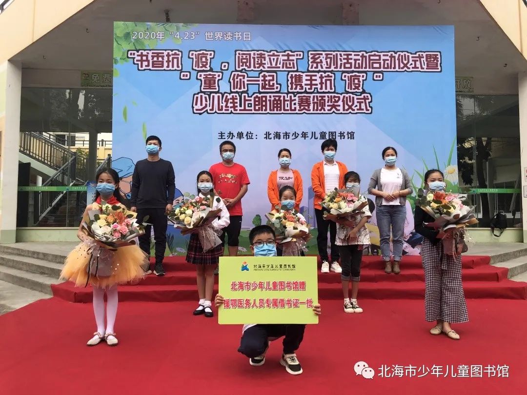 4月19日,在第25个“世界读书日”即将到来之际,北海市少年儿童图书馆在馆门前举行了“书香抗‘疫’,阅读立志”4.23世界读书日系列活动启动仪式暨“‘童’你一起,携手抗‘疫’”少儿线上朗诵比赛颁奖仪式。