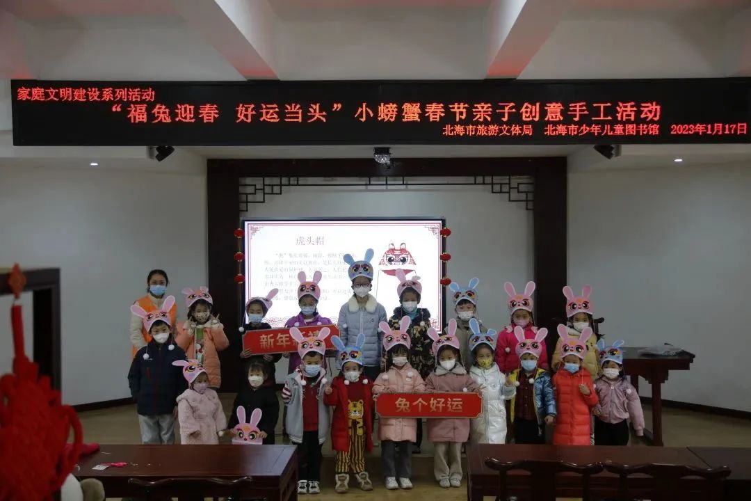 为营造喜庆热烈、文明祥和的春节氛围,传承文明家风,1月17日上午,北海市旅游文体局、北海市少年儿童图书馆以“福兔迎春 好运当头”为主题,在市少儿图书馆国学馆开展春节家庭文明建设创意手工活动。活动现场,馆员介绍了虎头帽在中华文化中的意蕴,让家长和孩子们了解到虎头帽的艺术特色和蕴含的文化内涵。随后,亲子家庭通过剪、贴等方式对虎头帽进行设计与装饰。