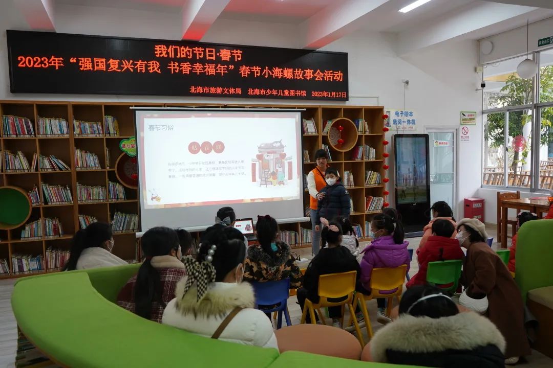 年关将至,春意渐浓。为弘扬中华民族传统文化、营造祥和喜庆的节日氛围,1月17日上午,北海市少年儿童图书馆在自助绘本馆开展了“我们的节日·春节”系列活动——2023年“强国复兴有我 书香幸福年”春节小海螺故事会活动。