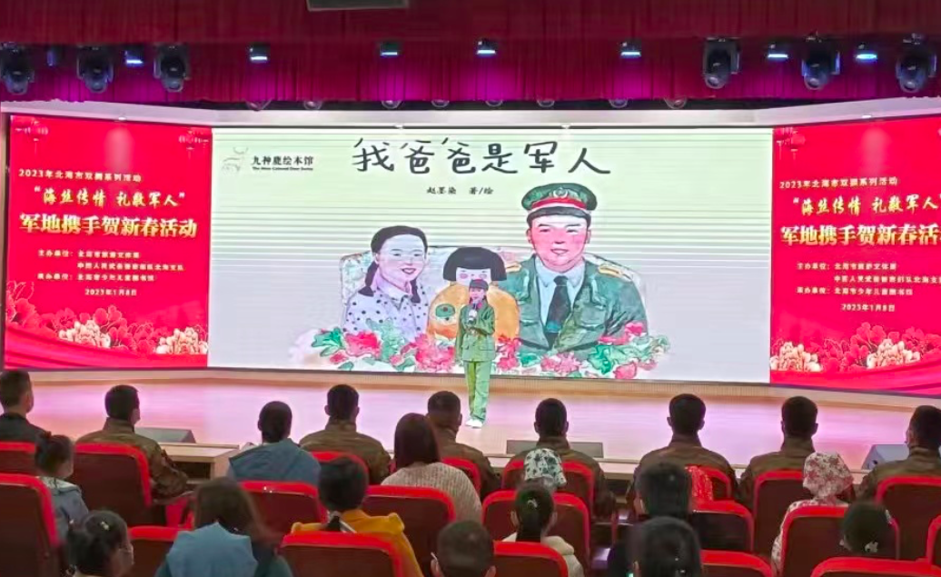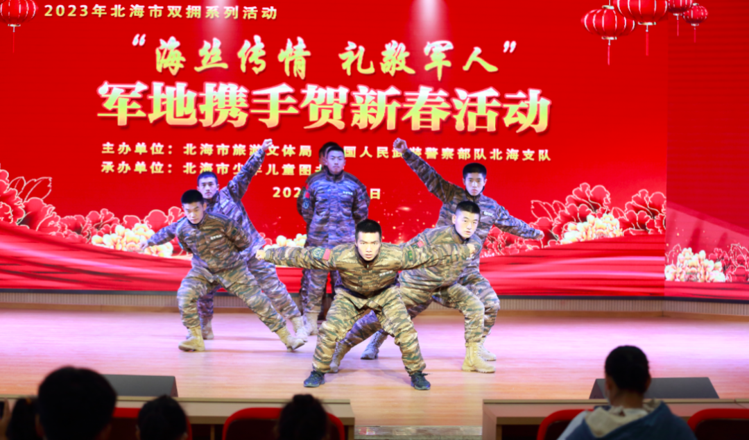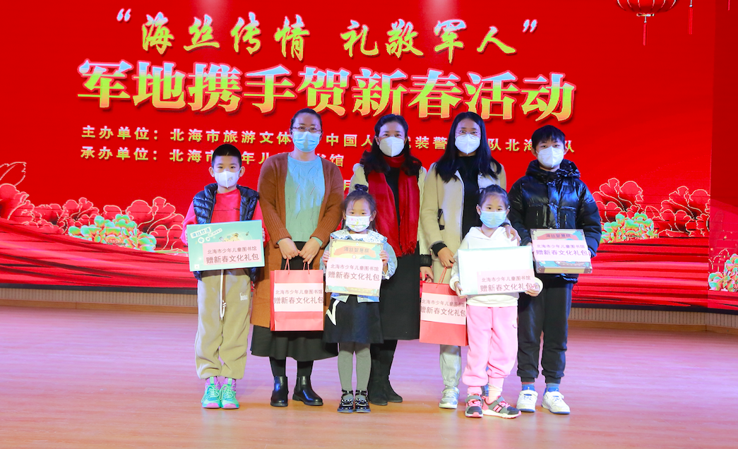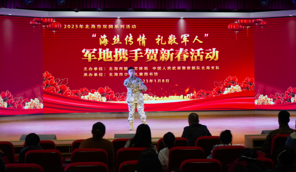 1月8日,市旅游文体局、中国人民武装警察部队北海支队、市少年儿童图书馆联合举办“海丝传情 礼敬军人”军地携手贺新春活动,通过多种艺术形式共同续写“军爱民、民拥军,军民鱼水一家亲”的深厚情谊。