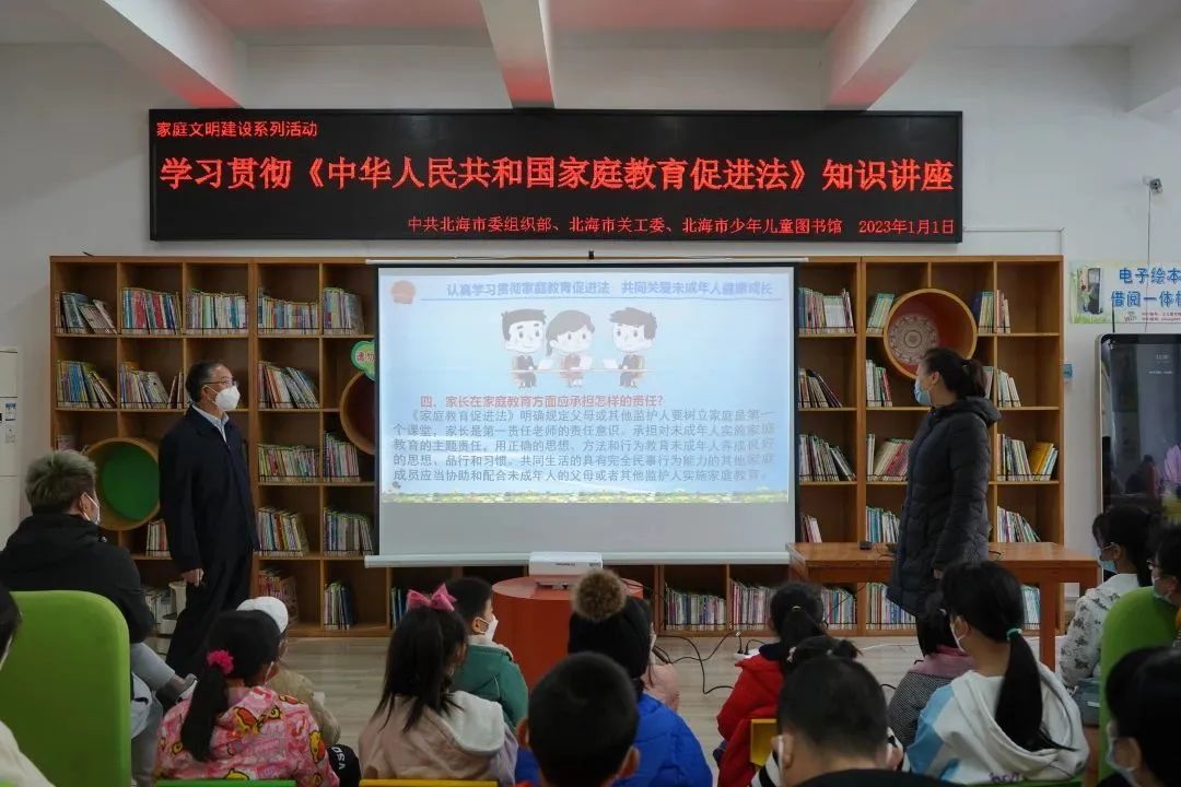 2023年伊始的1月1日,在《中华人民共和国家庭教育促进法》正式实施一周年纪念日,市少儿图书馆联合中共北海市委组织部、市关工委在自助绘本馆共同举办以深入宣传贯彻《家庭教育促进法》为主要内容的家庭文明建设系列活动。
