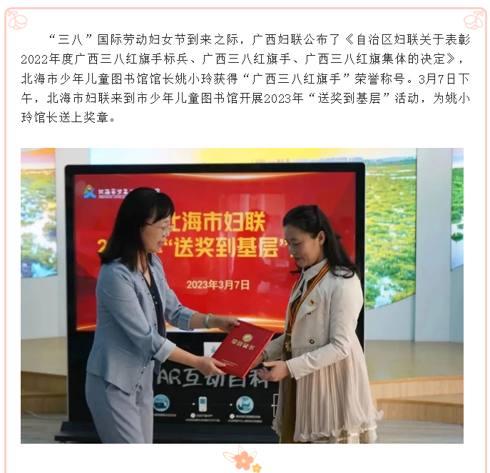 喜讯|北海市少年儿童图书馆馆长姚小玲荣获“广西三八红旗手”称号