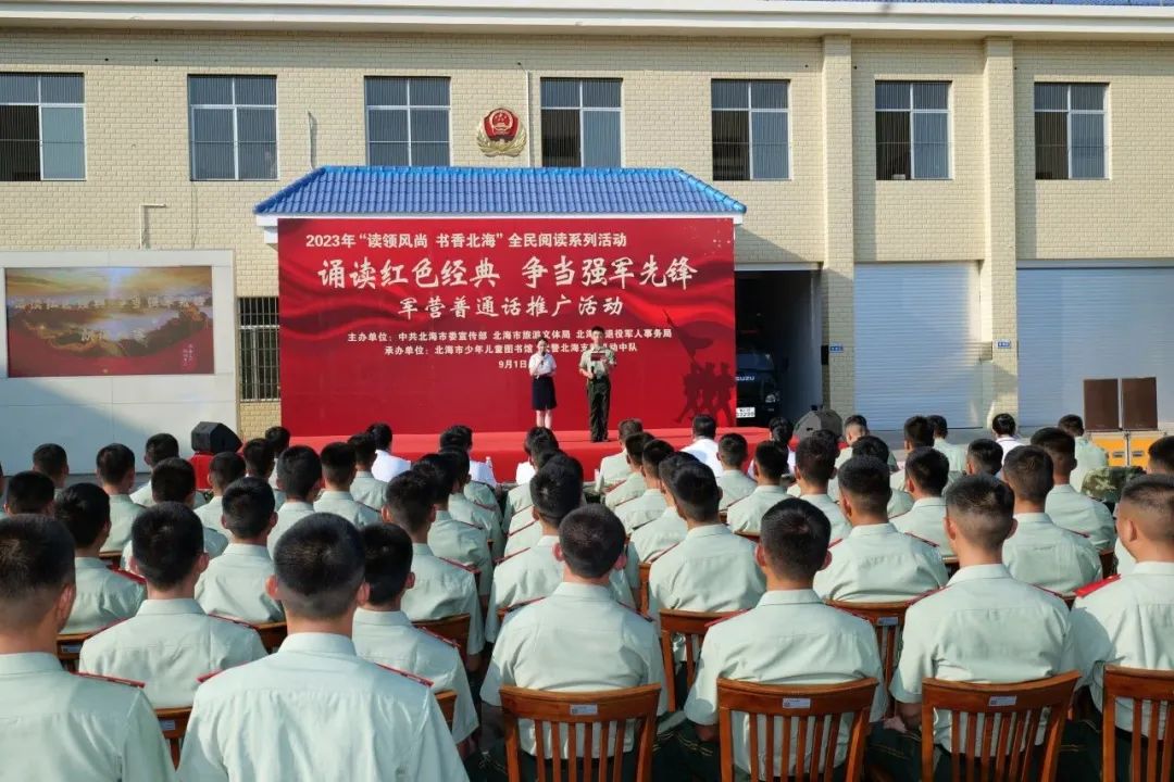 为进一步推进文化认同,向新时代强军兴军提供丰厚文化滋养和强大精神力量,认真做好推广普及国家通用语言文字工作,9月1日由中共北海市委宣传部、北海市旅游文体局、北海市退役军人事务局主办,北海市少年儿童图书馆、武警北海支队机动中队承办的2023年“读领风尚 书香北海”全民阅读系列活动——“诵读红色经典 争当强军先锋”军营普通话推广活动在武警北海支队机动中队营区举行。
