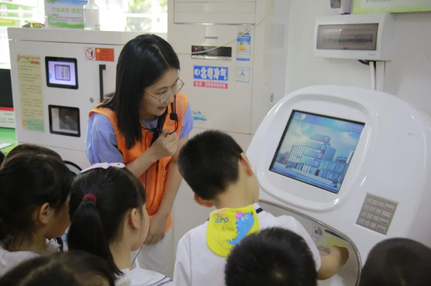 随后,在综合阅览室,馆员向他们介绍图书馆的功能,还向大家讲解图书借还和图书消毒的流程。小读者们跃跃欲试,在馆员的指导下学会独立使用自助借还机和图书消毒柜。