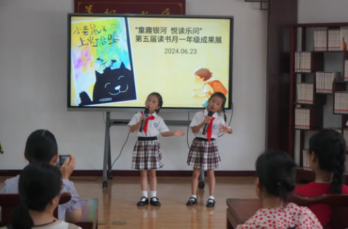 随后,馆内二楼国学馆,银河小学一年级与二年级的学生们分别为大家带来童谣创编《小老鼠又上灯台》,故事分享《笨狼的故事》两个节目。