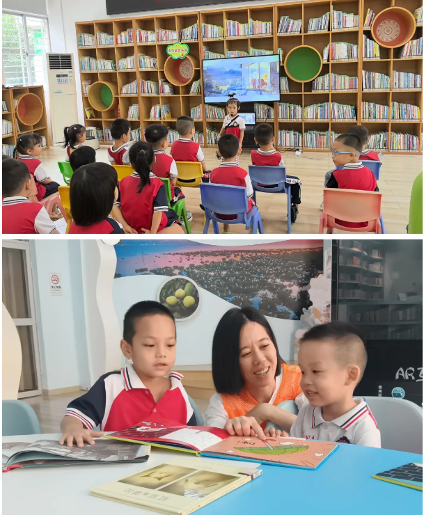 随后,孩子们走进自助绘本馆,这里色彩斑斓、温馨宜人,仿佛是一个梦幻的童话世界,形式多样、内容丰富的绘本让孩子们目不暇接。紧接着,海丝路阅读馆以其独特的海洋元素和丰富的历史文化藏书吸引了小朋友们的目光。馆员生动地讲述了海上丝绸之路的故事,激发了孩子们对广阔世界的好奇心和探索欲。