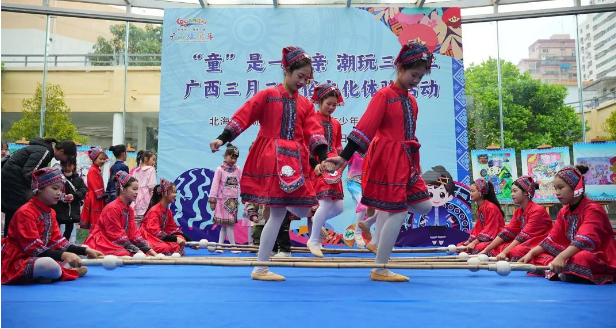 各族少儿手牵手灵活跳动,竹竿的碰撞声与参与者的欢笑声交织,市民游客在富有节奏感的音乐中感受着浓浓的壮乡风情。